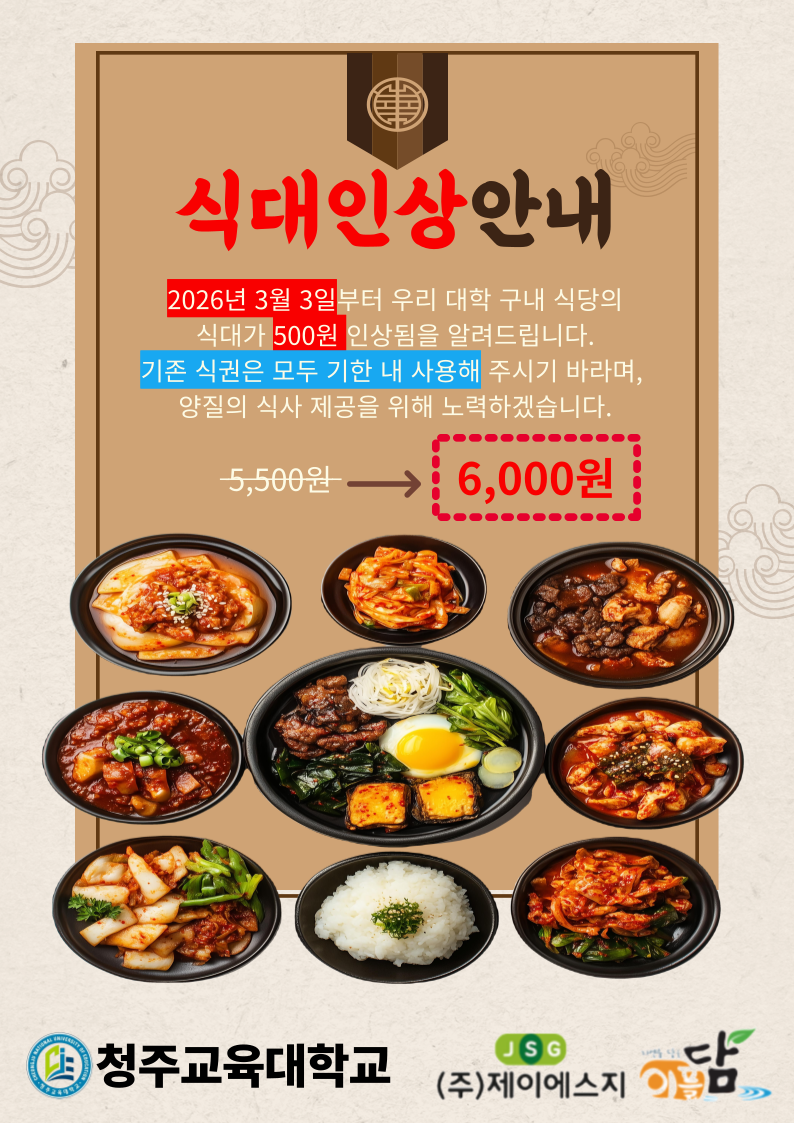 대학 구내식당 식대인상 안내